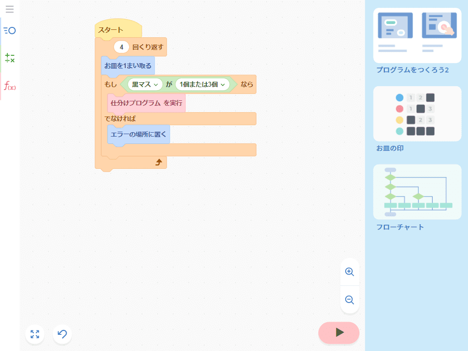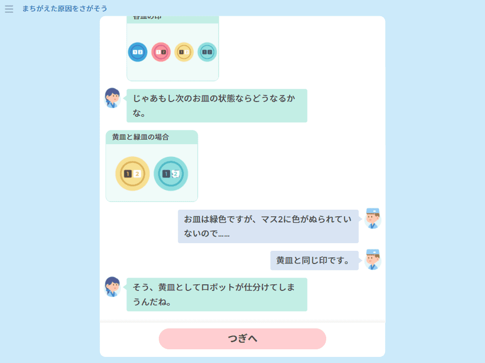 6年生のミッション「あやまりを検出しよう」では、お皿仕分けロボットがうまく機能しない問題を解決します。まずはプログラムに問題があるのか、お皿に問題があるのかを点検しながら、原因を探ります。次に、お皿に問題があり、これまでのルールでは対応しきれない部分について、新しいルールを追加することで補い、プログラムを修正します。