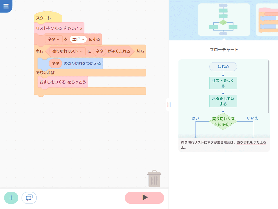 3年生のミッション「いろいろなちゅうもんにこたえよう」では、えびのお寿司が作れないという問題を解決します。まずは問題点の把握のために、ほかのネタの場合はどうか、どの工程で不具合が起きているのかなどを調べます。次に、売り切れのネタが注文された場合の対応について、どのタイミングで売り切れを調べたらよいかを考え、条件分岐を用いたプログラムで対応する方法を実行します。