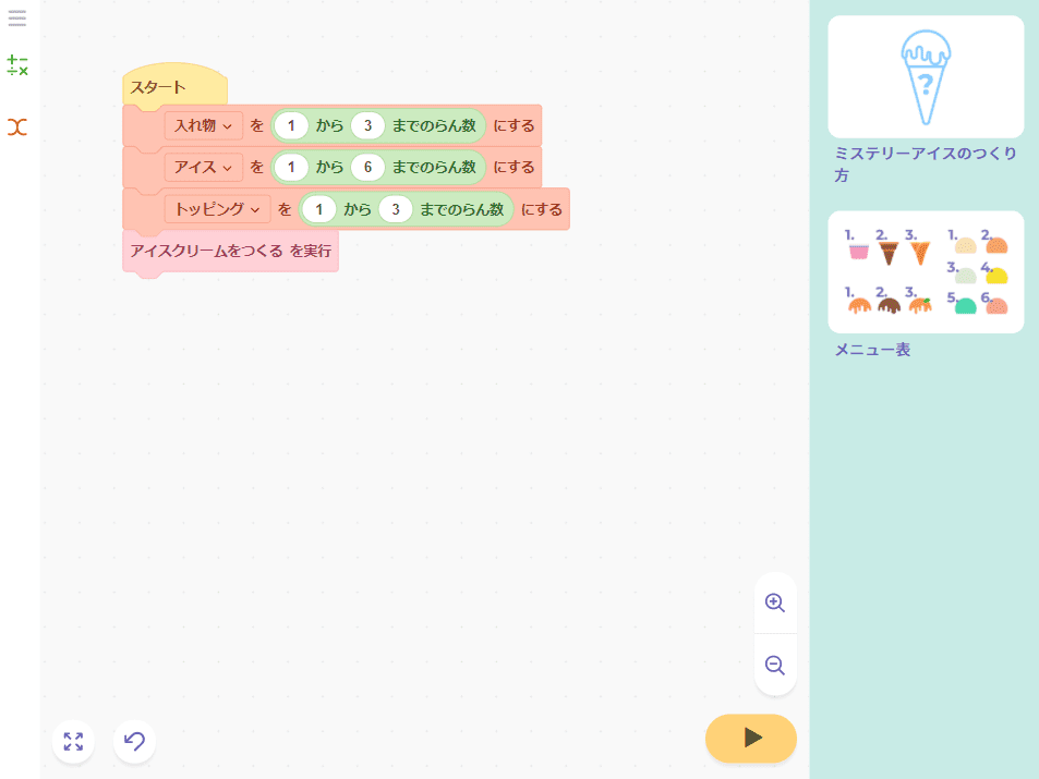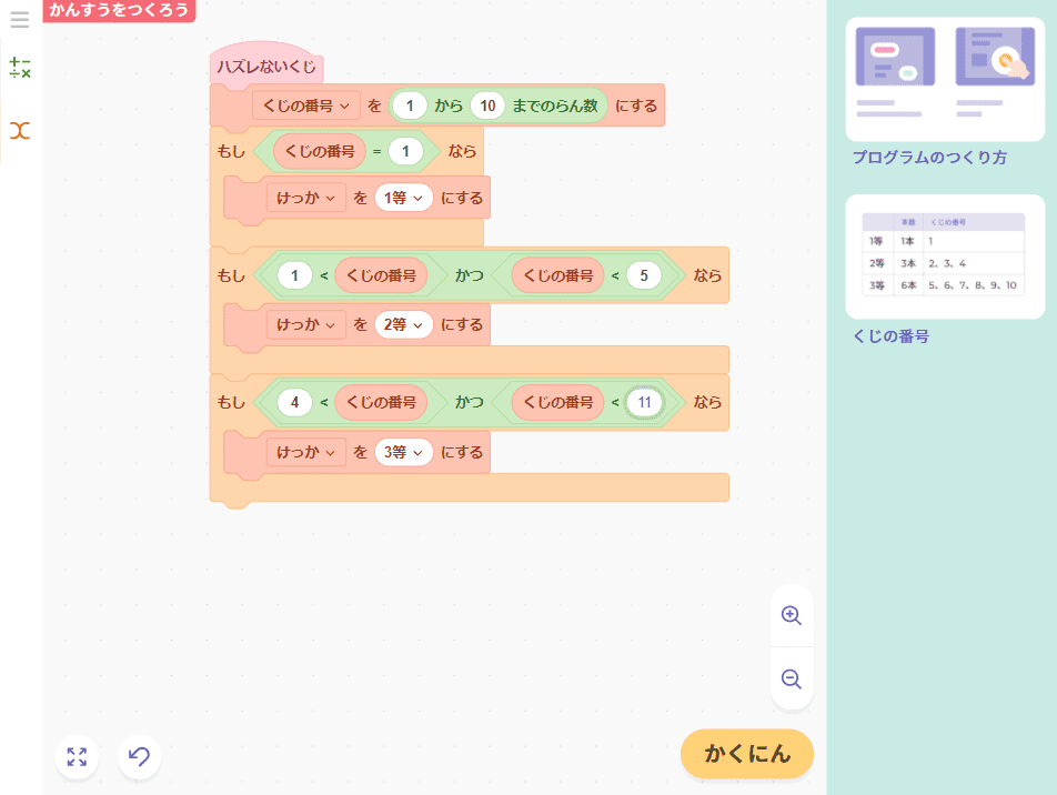 4年生のミッション「ロボットにおまかせしよう」では、乱数を使ってミステリーアイスやくじ引きのプログラムを作成します。また、くじの数を変えることで、当たりやすさを変えることにも挑戦します。当たりやすさを変える際には、「かつ」ブロックを使うことで分岐の際に、条件を複数指定できることも学びます。