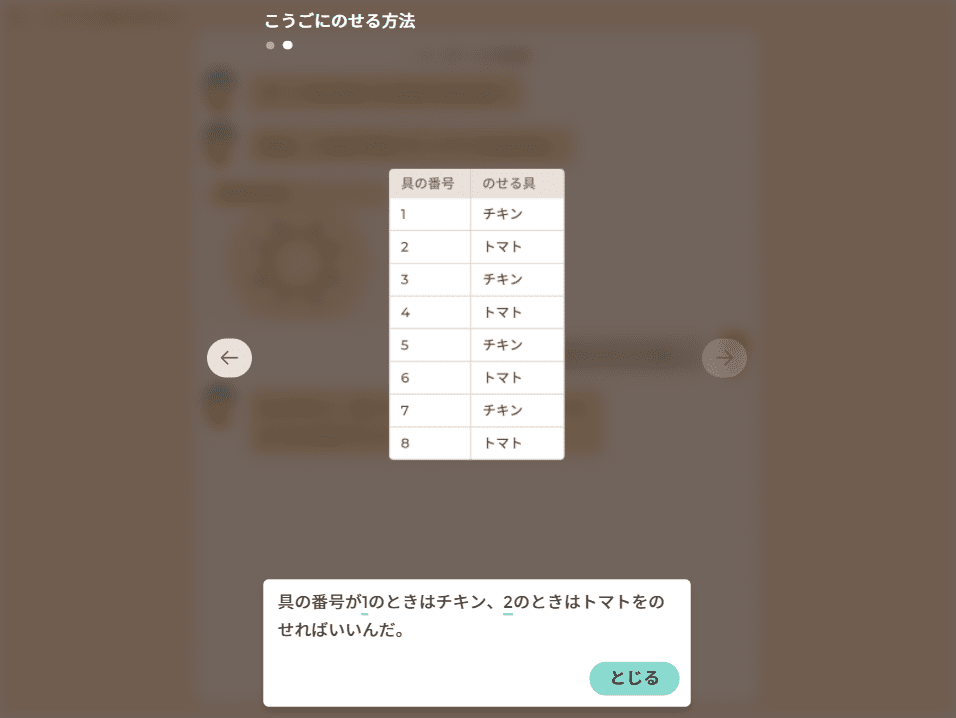 5年生のミッション「ピザに具をのせよう」では、ピザの具の配置を図形としてとらえ、プログラムを作成します。2種類の具を交互にのせる場合には、具を置く場所に1、2、3、……と数を割り当て、その数が2で割り切れるかどうかでどちらの具を置くかを判断させます。このように、「具を交互に置く」という作業をコンピュータに伝えるためにはどのように表現すればよいかを学びます。