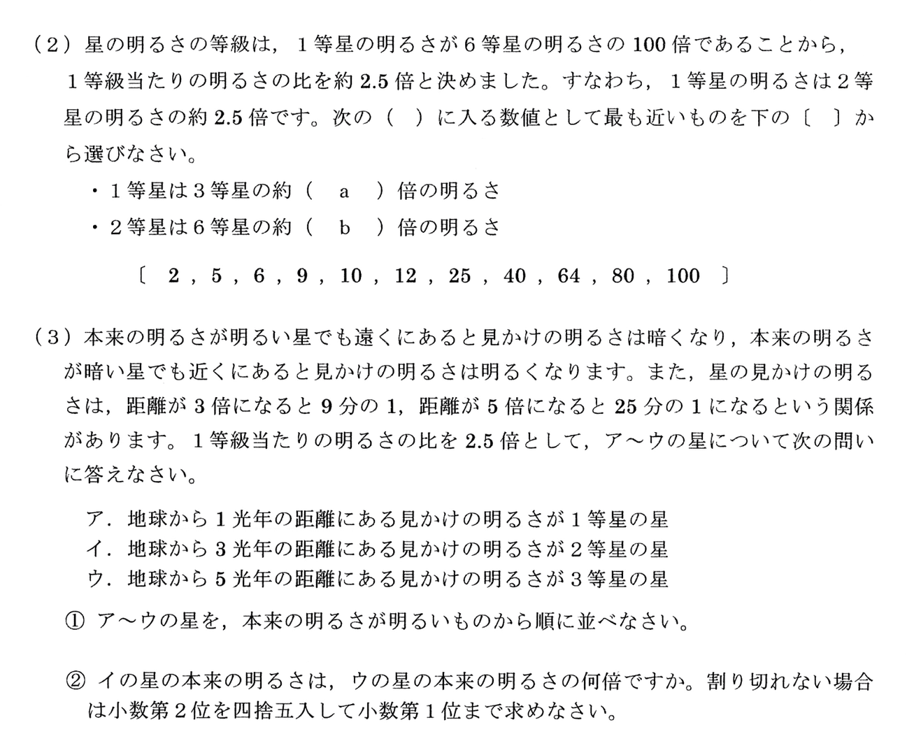 ある一つの星について、見かけの明るさと地球との距離から実際の明るさを求めることは比較的容易なのですが、今回の(3)のように、複数の星について実際の明るさを比かくすることを苦手とする人が多いため選定しました。苦手な人は、まずはどの星を基準にすべきかを考えることから始めましょう。