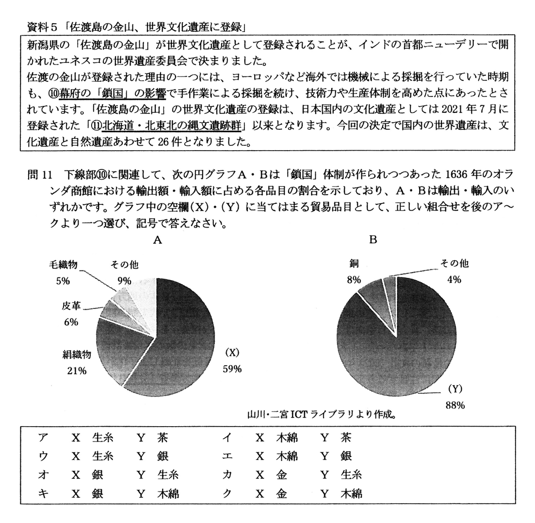読み仮名:資料、佐渡島の金山、世界文化遺産、登録、首都、開かれた、機械、採掘、時期、幕府、鎖国、影響、手作業、続け、技術力、生産体制、縄文遺跡群、以来、決定、自然、件、下線部、関連、次、商館、輸出額、占める、各、割合、空欄、貿易、選び、記号、絹織物、皮革、毛織物、その他、銅、二宮ICT、作成、銀、木綿