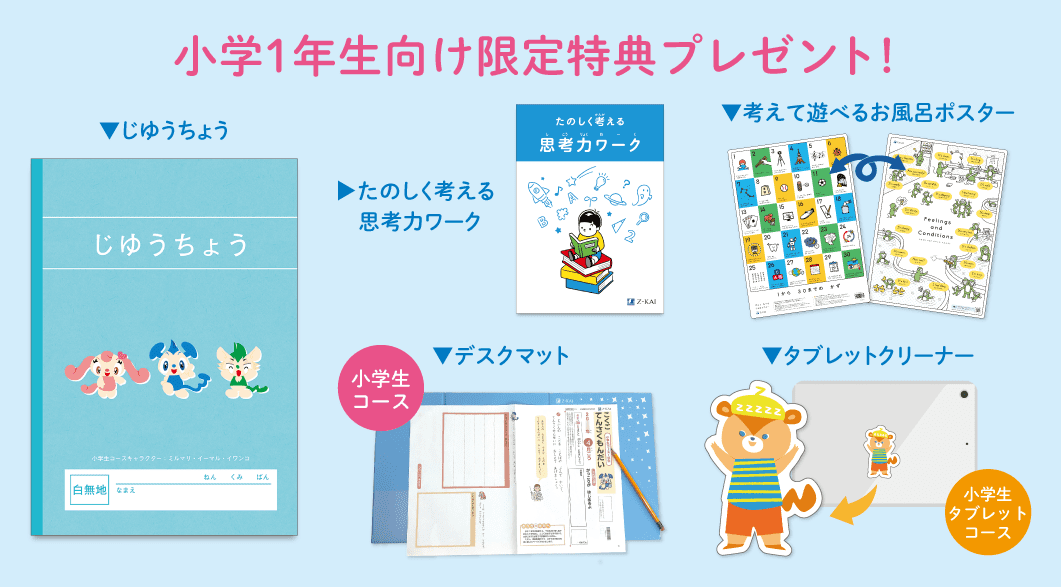 ※ご受講内容によって教材構成は異なります。「小学生コース1年生」のコース内容やお手続きについて詳しくは、12月上旬にお届け予定の「新年度のご案内」をご覧ください。