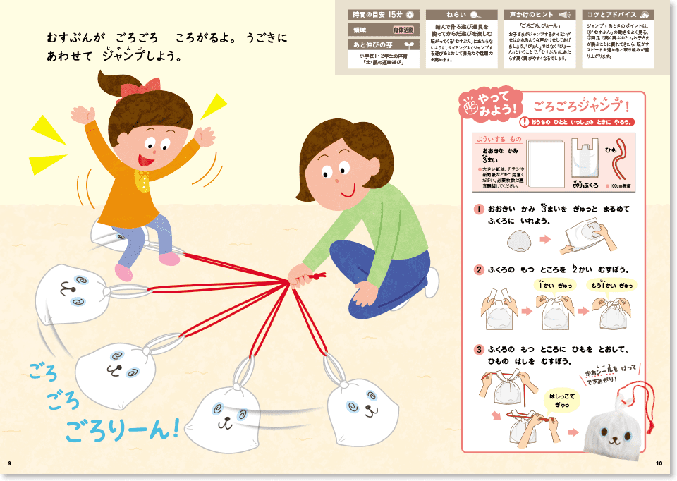 袋の持ち手を結んだり、ひもを結んだりして、ごろごろ転がる「むすぶん」を作ります。できあがった後は「むすぶん」にあたらないように、タイミングを合わせてジャンプ。「結ぶ」ことが楽しい遊びにつながる実感ができる取り組みです。