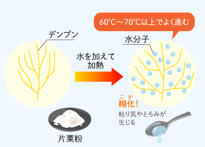 料理のとろみづけに使われる片栗粉は、じゃがいものデンプンを取り出して粉にしたものです。デンプンは、たくさんのブドウ糖が長い鎖のようにつながり、ところどころで枝分かれしています。生の状態ではこれがギュッと密に詰まっていますが、水と熱を加えると、デンプンの鎖がゆるんで間に水が入り込み、ふやけて広がります。この鎖同士が絡み合うことで、粘り気やとろみが生じるのです。この現象をデンプンの「糊化」といいます。糊化は概ね60〜70℃以上で起こり、温度が高いほどよく進みます。