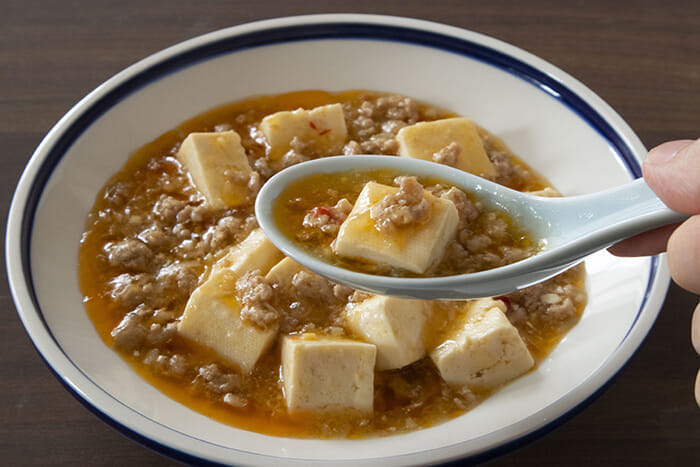 麻婆豆腐の場合、豆腐の水分や油脂による影響も考えられます。豆腐の約9割は水分で、加熱すると凝固と収縮が進み、水分がギュッと絞り出されます。この水があんを薄めてしまっているかもしれません。
