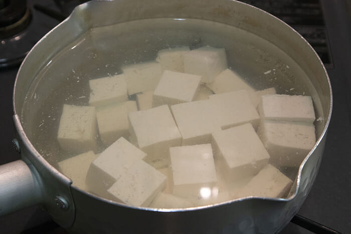 あらかじめ下ゆでして、水分を出してから加えると、これを防ぐことができます。下ゆでの時点で豆腐の中までよく温まるので、あんは熱々なのに豆腐の中がぬるいという状態も防げます。