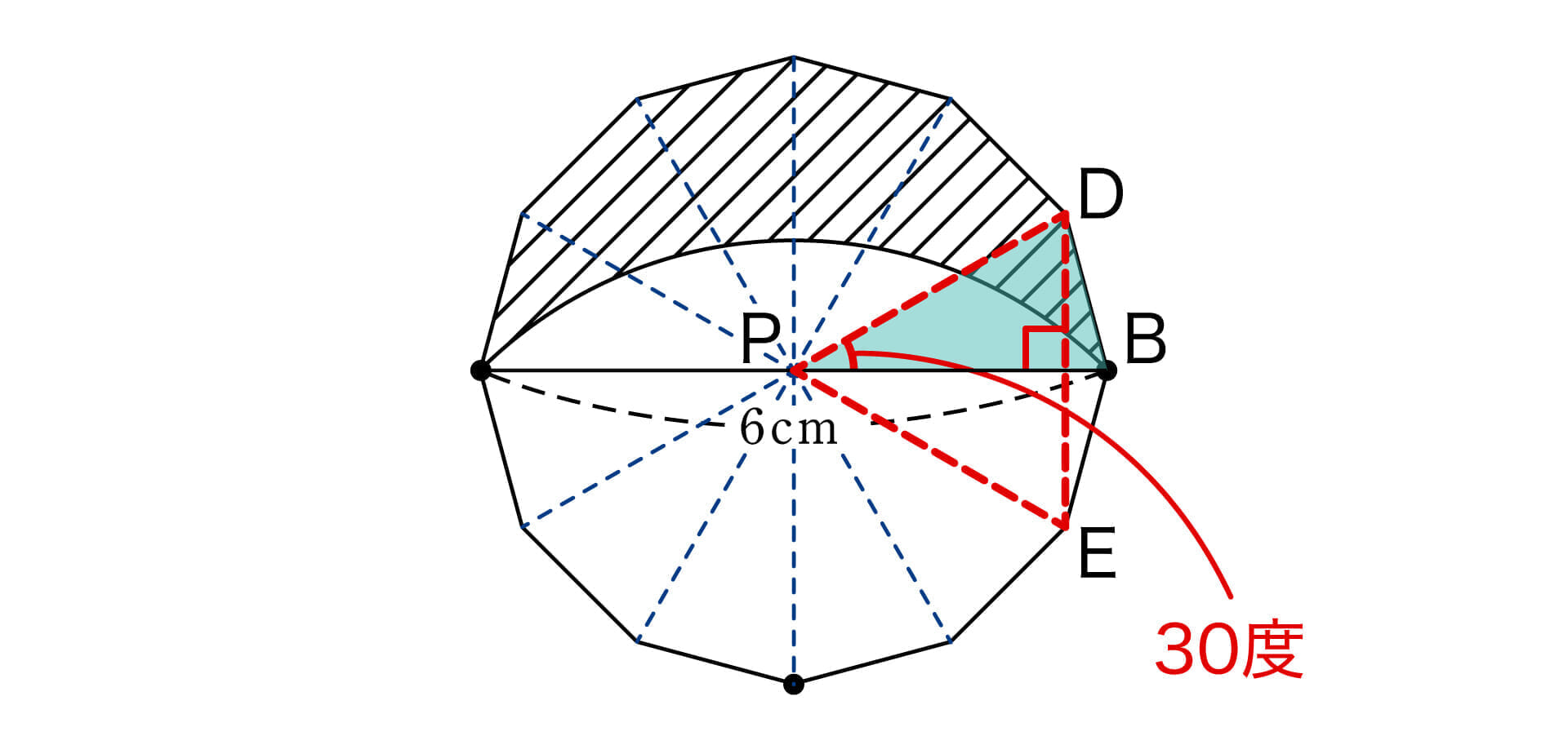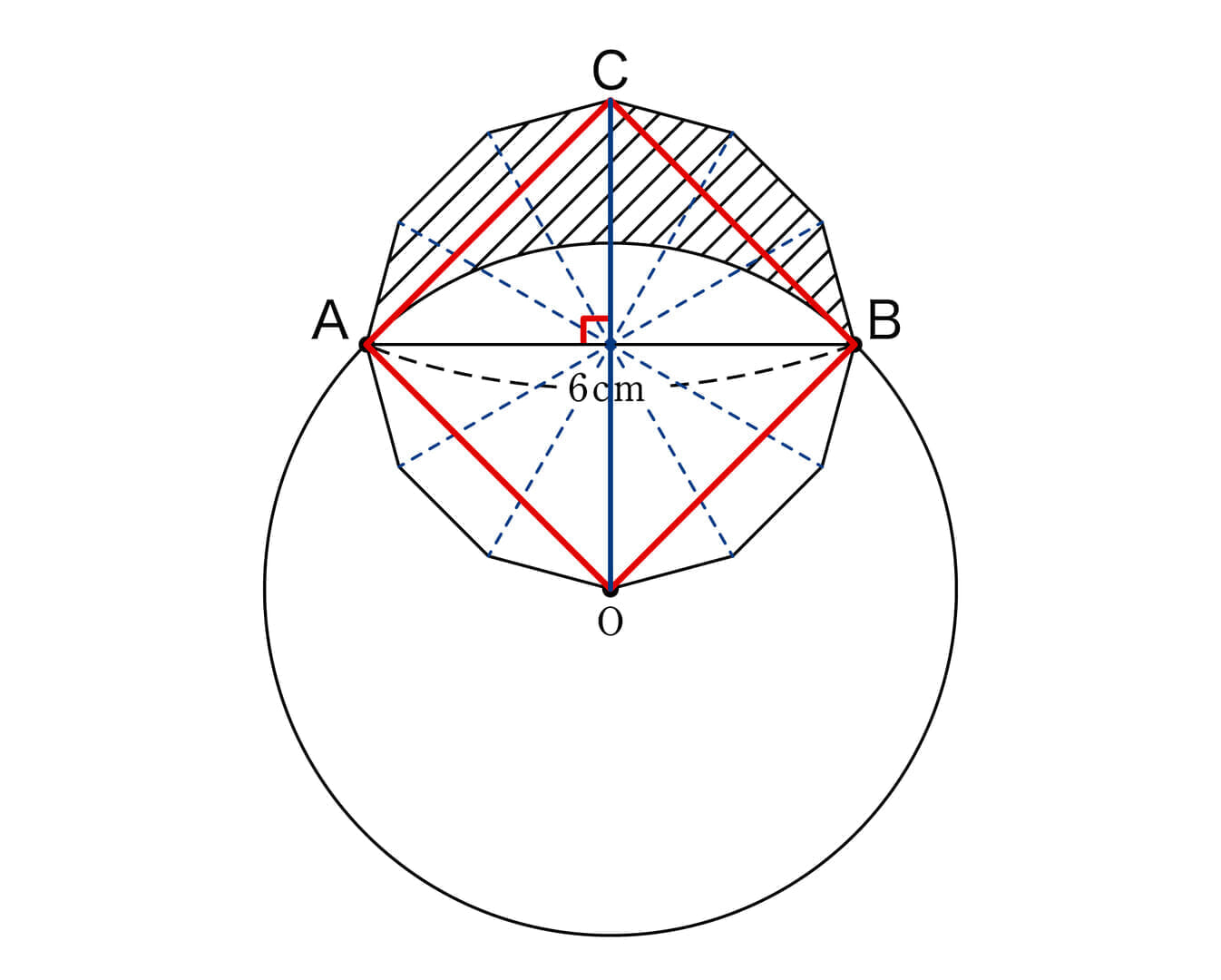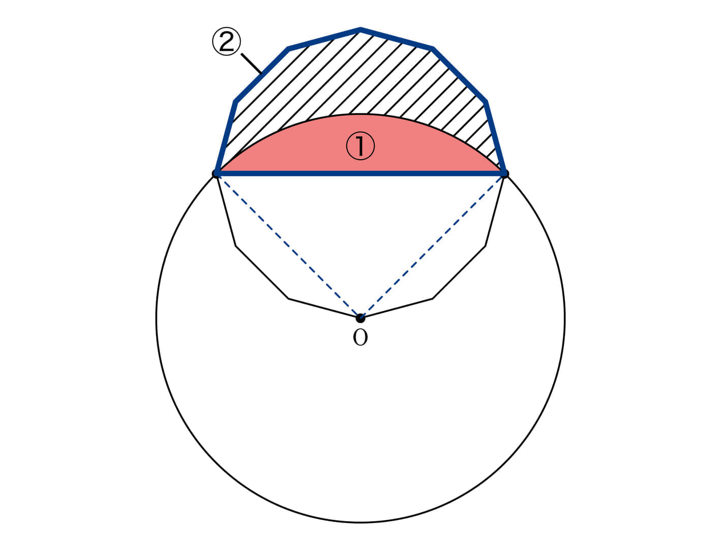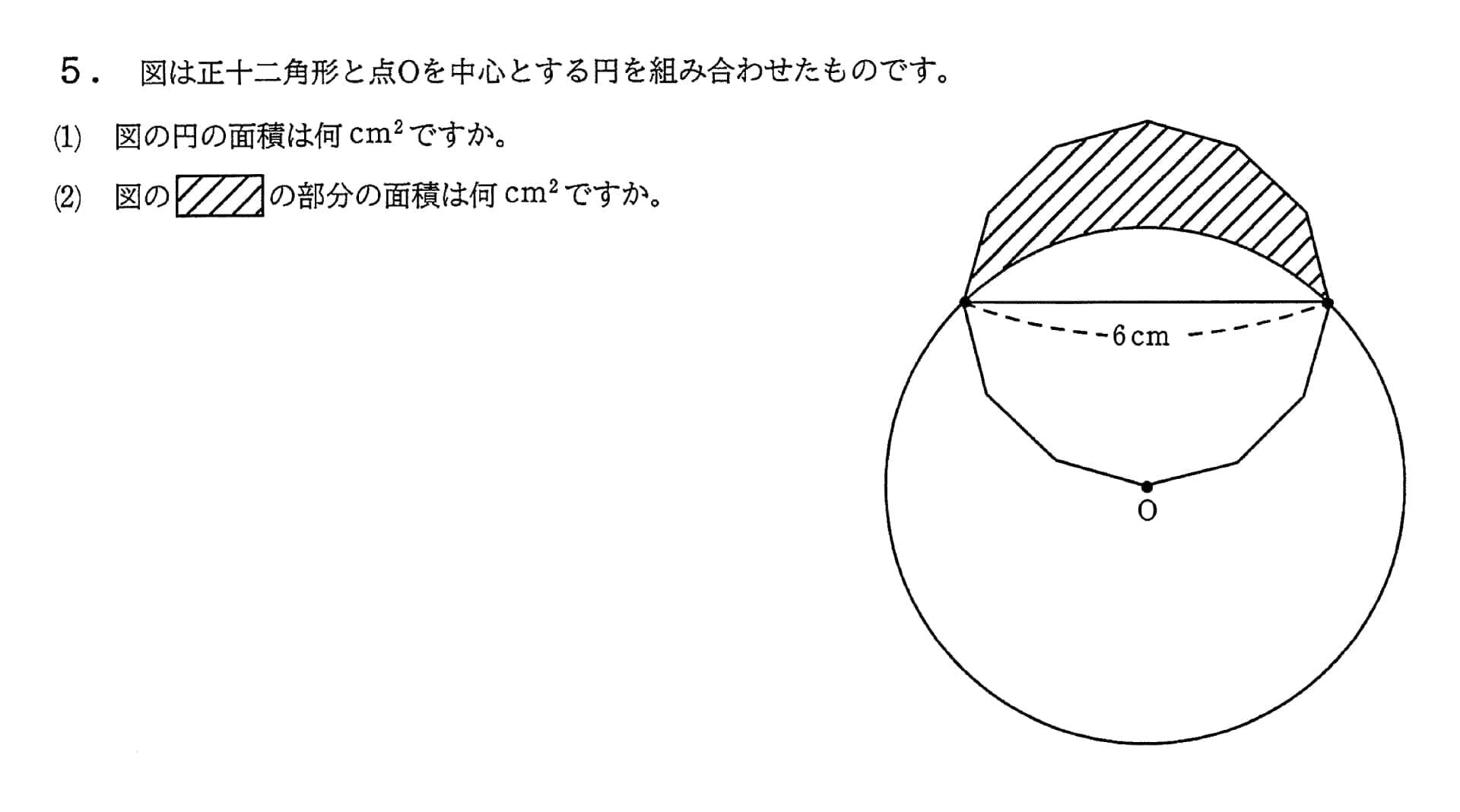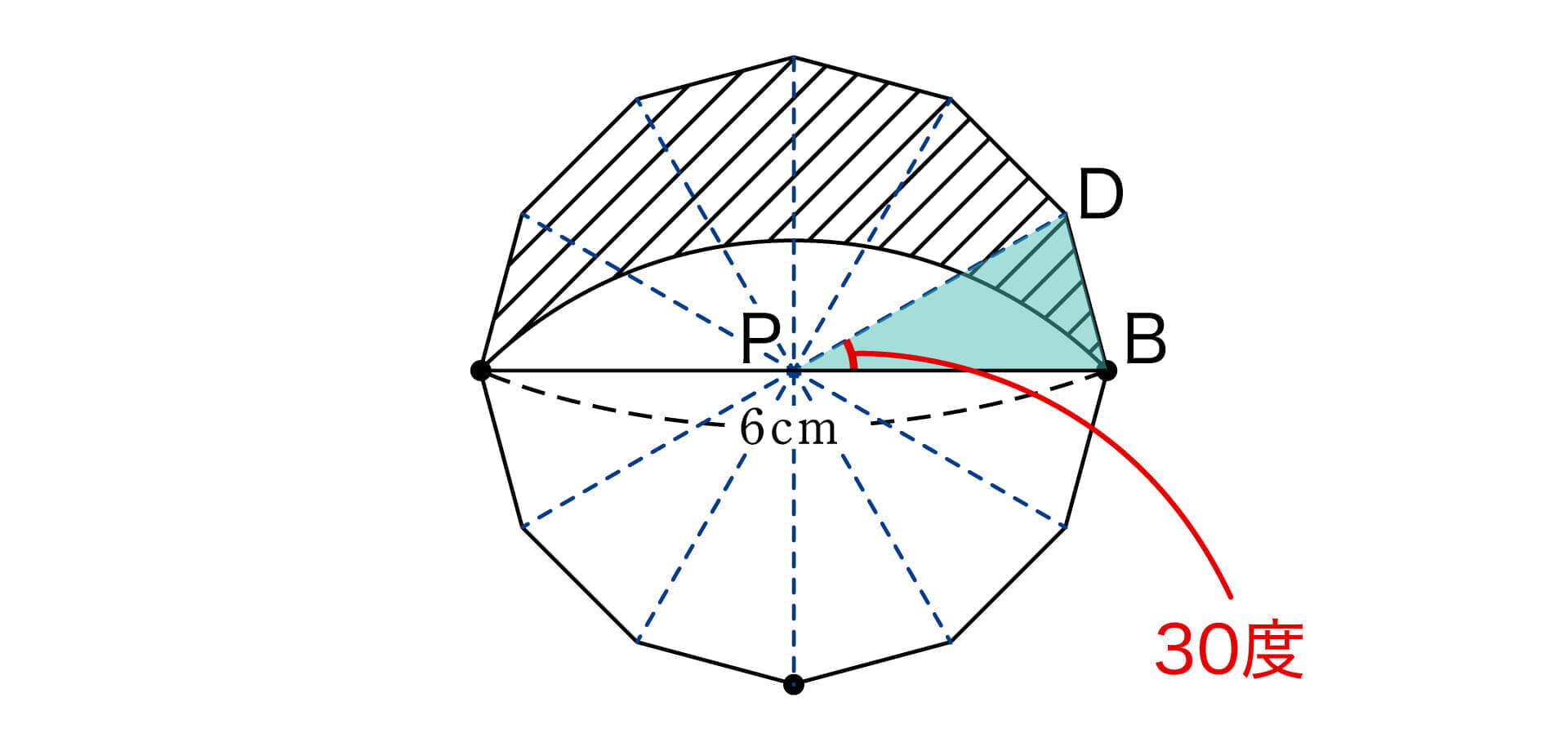 (2)求めるのは、「正十二角形の半分」から、「おうぎ形から直角二等辺三角形を除いた形」を除いた部分です。