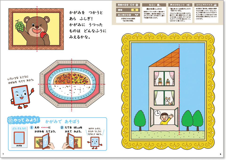 紙面のイラストを使って鏡の映り方を確認し、線対称の概念にふれていきます。「おもしろいな」と鏡の不思議さを楽しみましょう。