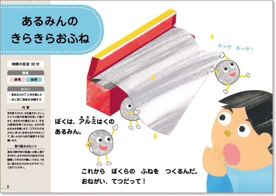 アルミ箔で舟を作り、水に浮かべて遊びます。ご家庭にあるものを荷物として舟に載せることで、ものが水に浮いたり沈んだりする現象を体験。実験感覚でものの浮き沈みのおもしろさを体感できる取り組みです。アルミ箔が破れないように気をつけて舟を作る作業は、指の力加減を知り、手先の器用さを養うよい練習になります。