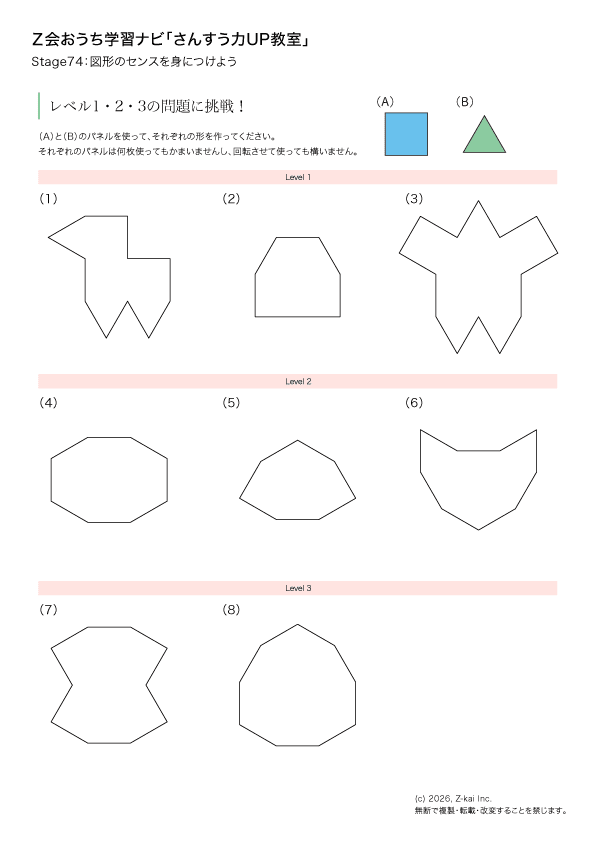 問題の意味はいいですね。正方形(A)と正三角形(B)を使って、決められた形を作る問題です。まずはお子さまのやりたいようにやらせてあげましょう。それぞれのパネルは、もちろん、何枚使ってもかまいませんし、回転させて使ってもかまいません。最初のうちは、定規はむしろ使わずにやってほしいので、保護者のほうから定規を使うよう勧める必要はありません(お子さまが自分で使い始めた場合は、特に止めなくても大丈夫です)。