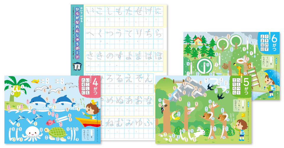 ※『ひらがなだいすきワーク』(4~10月号)は該当月の教材に同封してお届けします。ホワイトボードマーカーで消せるひらがな練習ボードも年中スタートセット同封でお届けします(マーカーをご用意ください)。