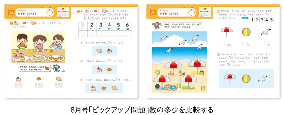 【数・形・論理】では、小学校への入学を見すえた無理のない「算数学習」として、幼児にとってなじみのある具体物を使い、数を数える問題から始めます。たし算・ひき算の基礎となる数の合成・分解にも挑戦していきます。