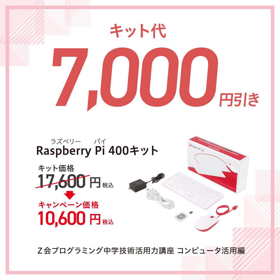 「Z会プログラミング中学技術活用力講座 コンピュータ活用編」のご受講にはRaspberry Pi 400、テレビやモニターなどのディスプレイが別途必要となります(HDMI端子あり・スピーカー内蔵)。また、Raspberry Pi OSや本講座で学習するアプリのバージョンの検証状況はこちらでご確認ください。