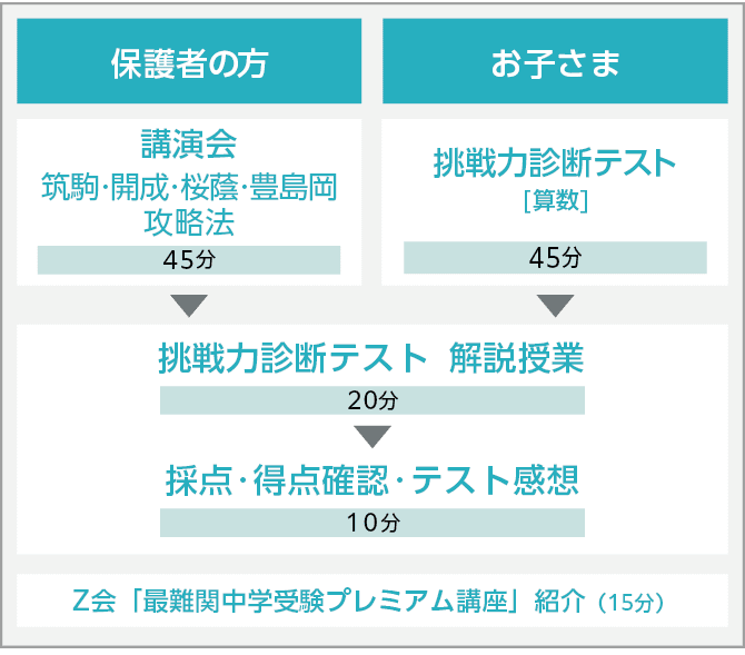 その間、お子さまは、難関校で必須の「数の感覚」を問う問題を中心とした「挑戦力診断テスト(算数)」を受け、現時点で各校の入試に立ち向かう準備がどのくらいできているかを確認していただきます。