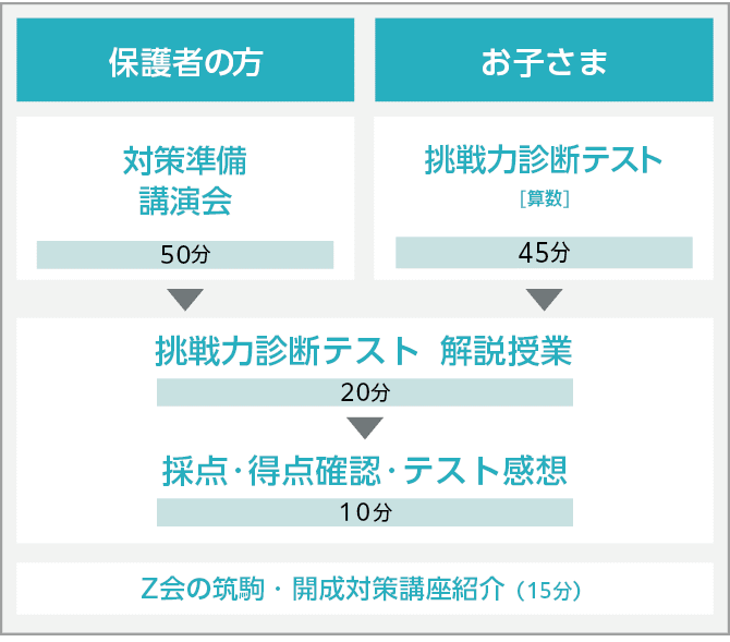 その間、お子さまには「挑戦力診断テスト(算数)」を受けていただきます。現時点で最難関中学入試に立ち向かう準備がどのくらいできているかが確認できるテストです。テスト後は、最難関校入試の攻略に直結する解説授業をお聴きいただけます。